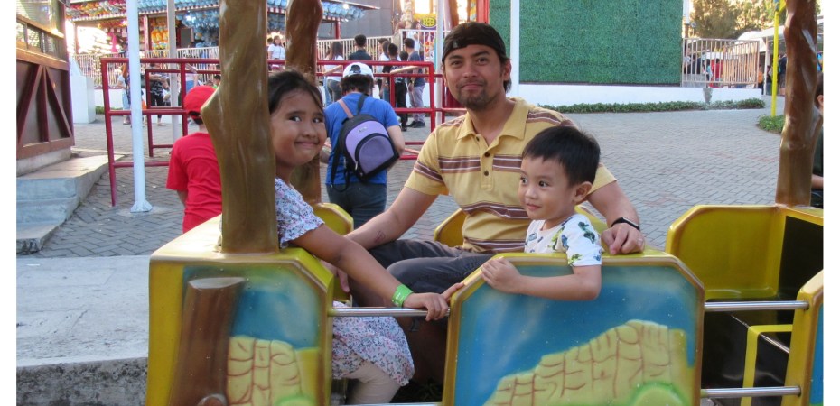 It’s almost getting dark, but before we proceed with dinner, Ate Rei and Sai really want to make their stay worth it by still going to a lot of rides in the other side of the park. Here they are in a Sky Cruiser, it gives its riders an exciting aerial ride where they can control their vehicle by pedaling it around the track. Our little Sai was so sad and crying this time as he cannot enter the Sky Cruiser due to height restrictions. Poor Sai, you better eat lots of rice. hehe… 🙂 They also enjoyed this fast swing for kids. And now it’s Papa Dave’s turn to be envious.