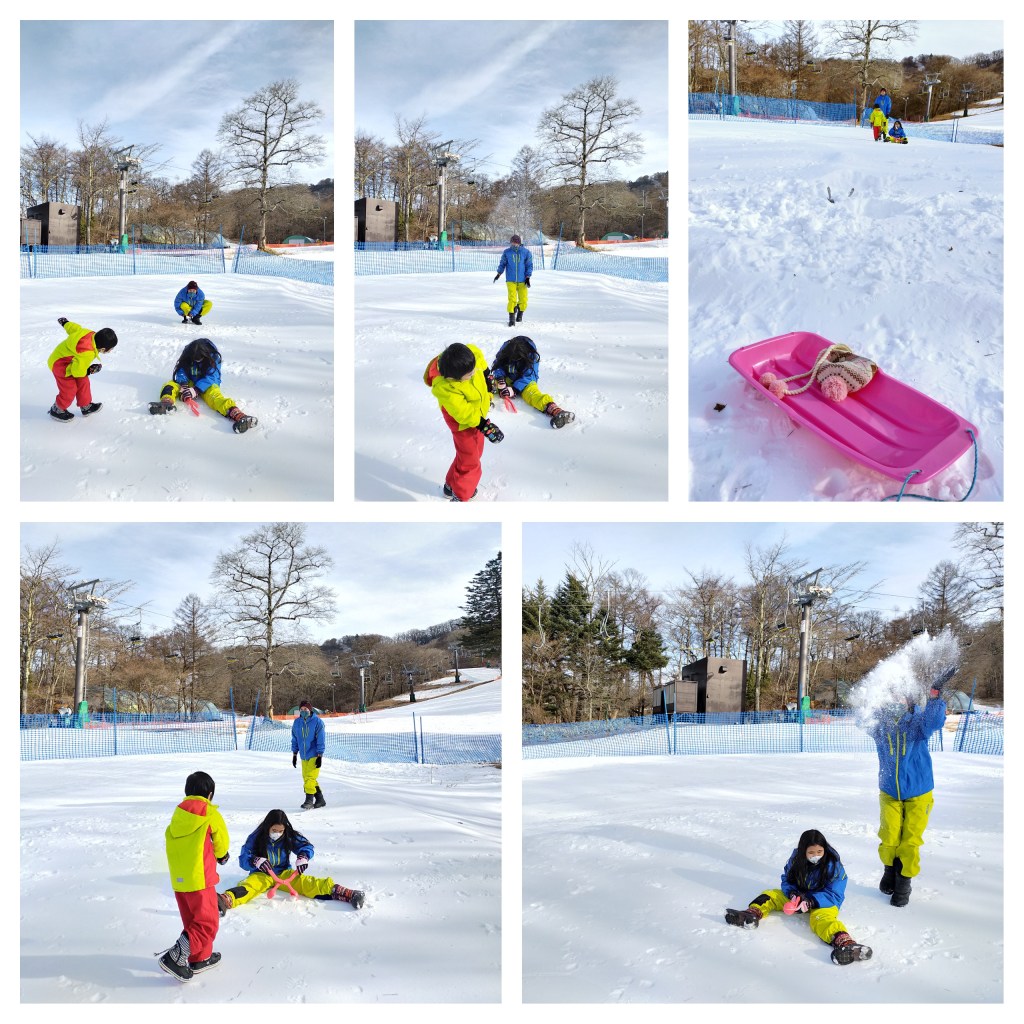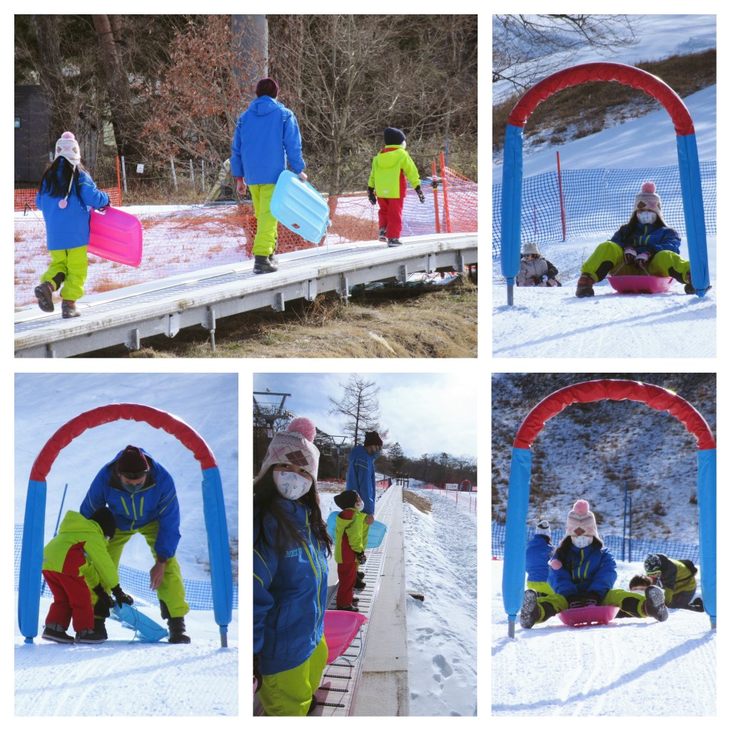 This is the Prince Snow Resort in Karuizawa, Nagano, Japan. The Karuizawa Ski Resort, also known as the Karuizawa Prince Hotel Ski Resort, is renowned for being very readily accessible from Tokyo, being just over an hour from Tokyo or Ueno via bullet train. Here are the kids and Papa Dave so ready to dive in, I mean, slide in with their sleds.
