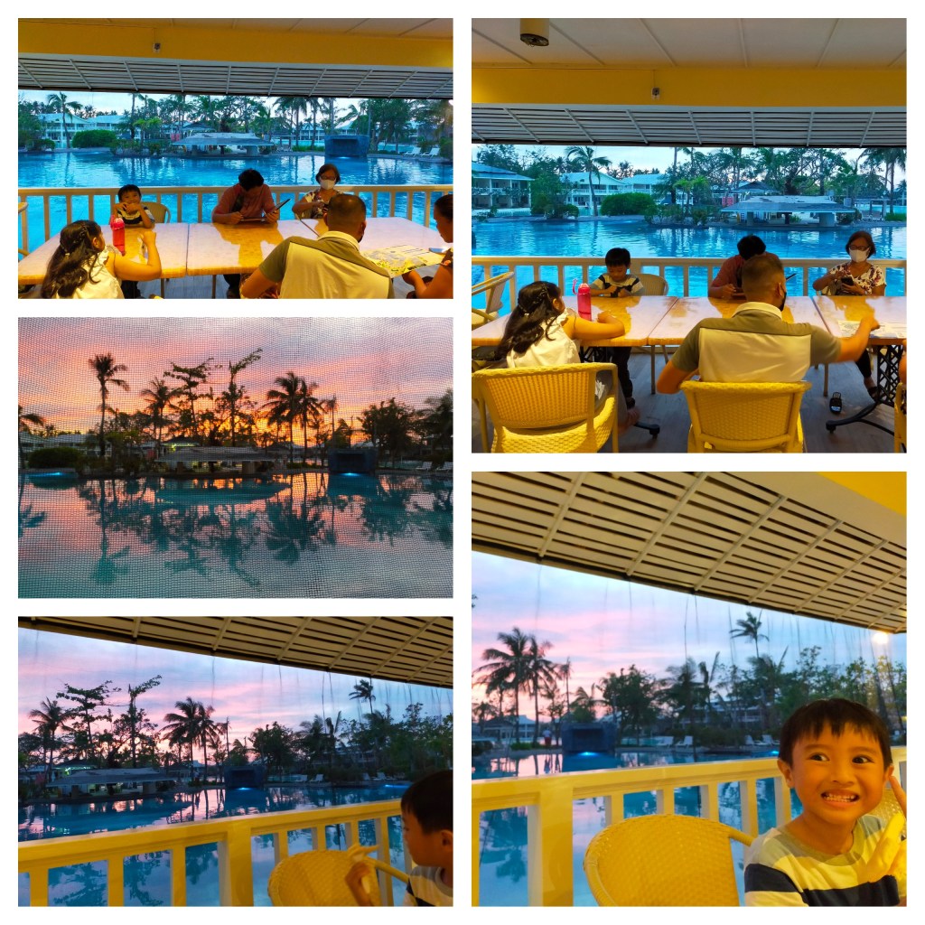 Just look at our surrounding scene. Magical sunset by the pool. The coffee shop is surrounded by a gigantic swimming pool. Features international and Filipino favorites, a special childrenβs menu, and their world-famous Breakfast Buffet with different culinary themes for every day of the week. Ate Rei is enjoying her pizza. π