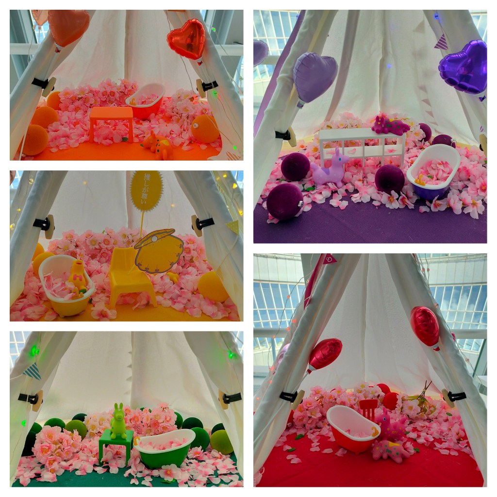 These are the exhibit mini tents I showed earlier. I had the chance of taking a photo of each of them as I was intrigued what was inside them. It’s just a small batch tub, surrounded by flowers, and mini toys.