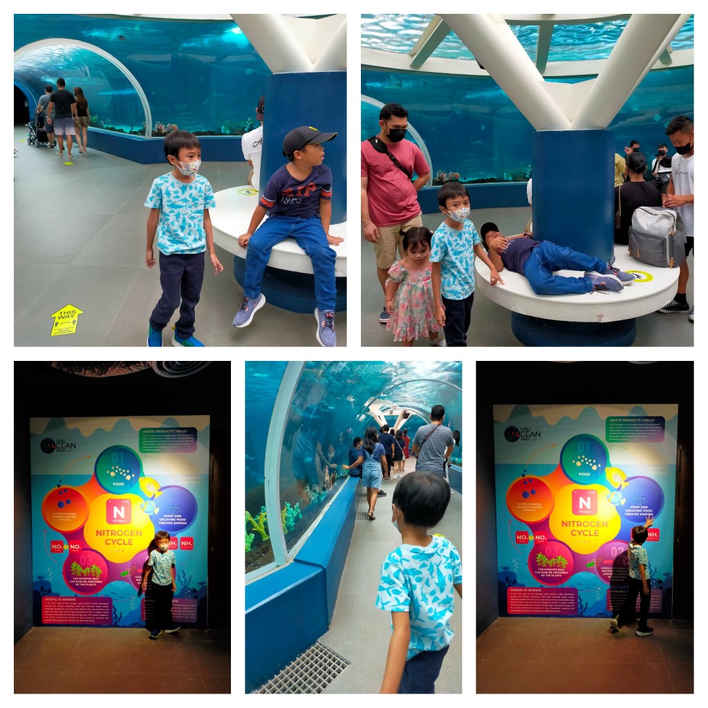 After the show, we spent time inside the tunnel to explore all kinds of fishes available. Sai, Tim, and Tom tried to name the fishes they see. While little Zara only refers to them as sharks. hehe π