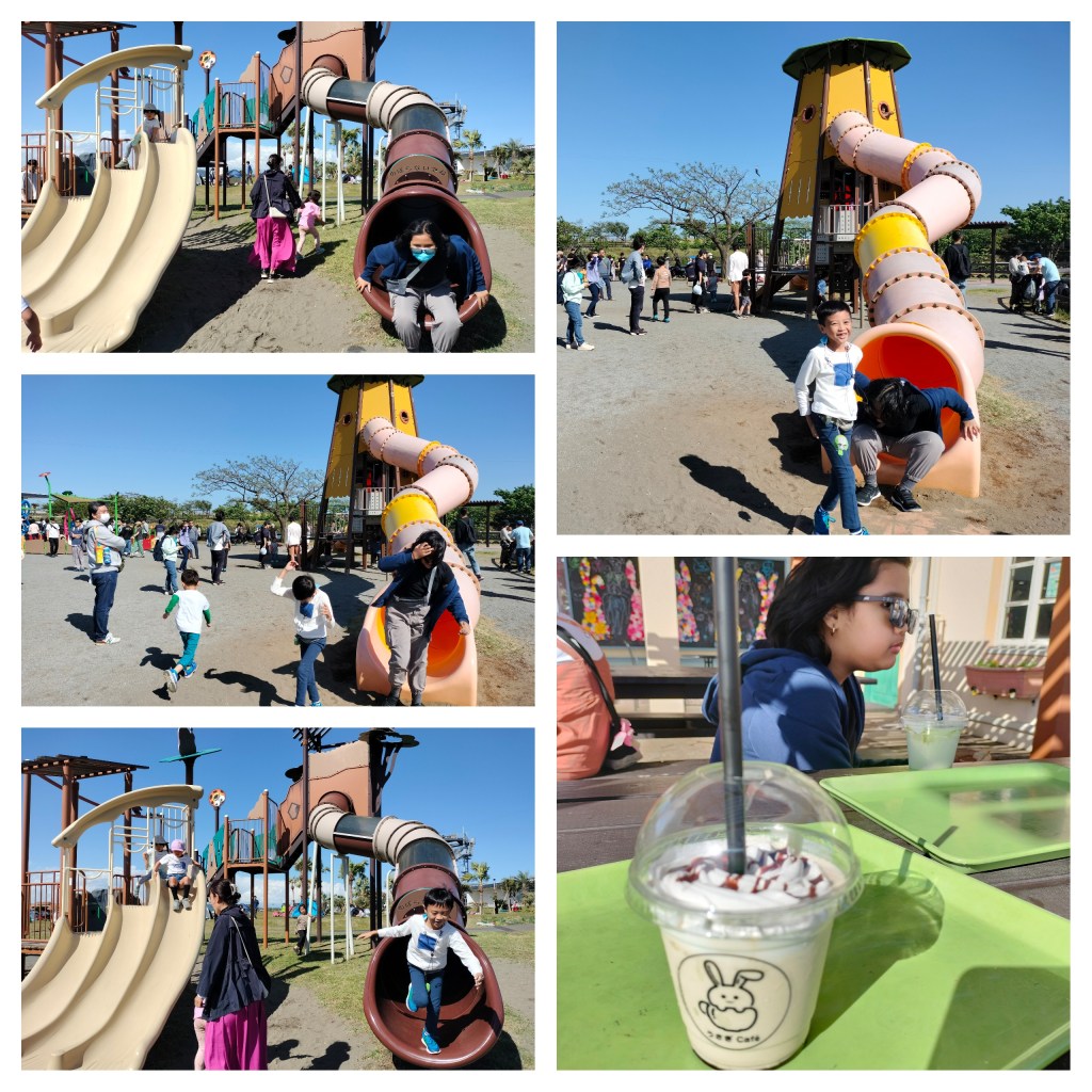By the time we got tired of sliding, we went to the RV Campsite area. The round, colon-shaped green kitchen car stands in THE VIEW with a 180° view of the ocean! This is a pet-friendly café where you can stop by with your pets on your way to walk along the Boardwalk!