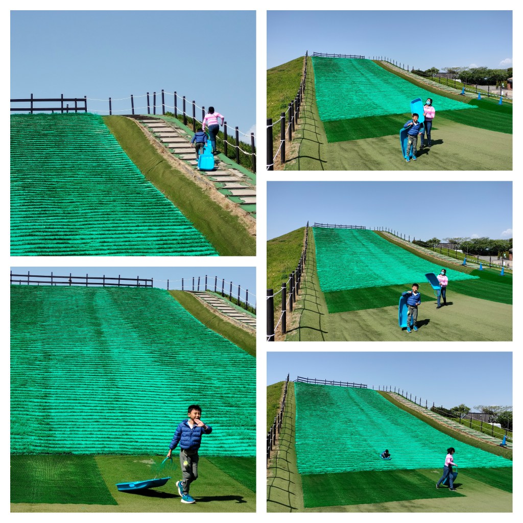 We finally had the chance to get in the Shiva Slider early in the morning. Yesterday, there were lots of kids lining up in here! This is a sledding attraction with a maximum slope of 18 degrees and a total length of 44 meters. In the photos, it looks like the grass slide is floating. 🙂