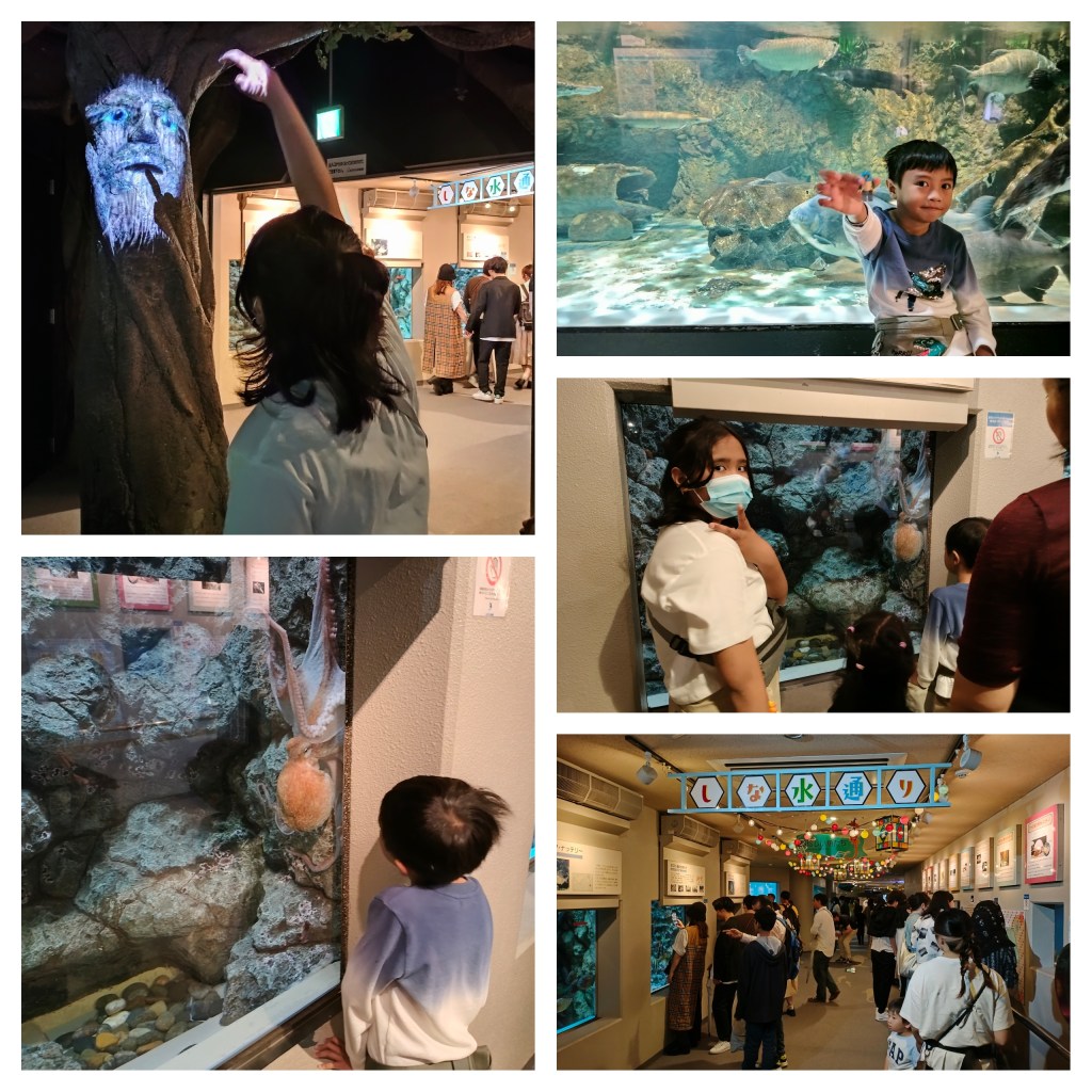 The aquarium consists of two floors, providing multiple different viewpoints of the various sea creatures. Great efforts have been made to showcase both typical Shinagawa sea life as well as more exotic sea creatures. Our little Sai is in awe as he follows the octopus trying to hide and changed colors.