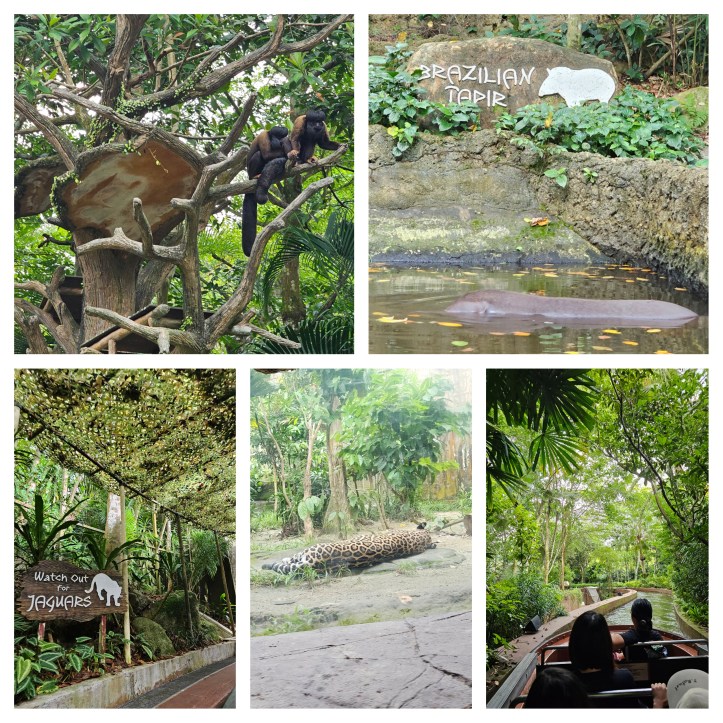 The Amazon River Quest is a boat ride that features several South American animals such as collared peccaries, brown capuchin monkeys, red howler monkeys, red-backed bearded sakis, brown-headed spider monkeys, giant anteaters, guanacos, Brazilian tapirs, jaguars, black howler monkeys, flamingos and capybaras.