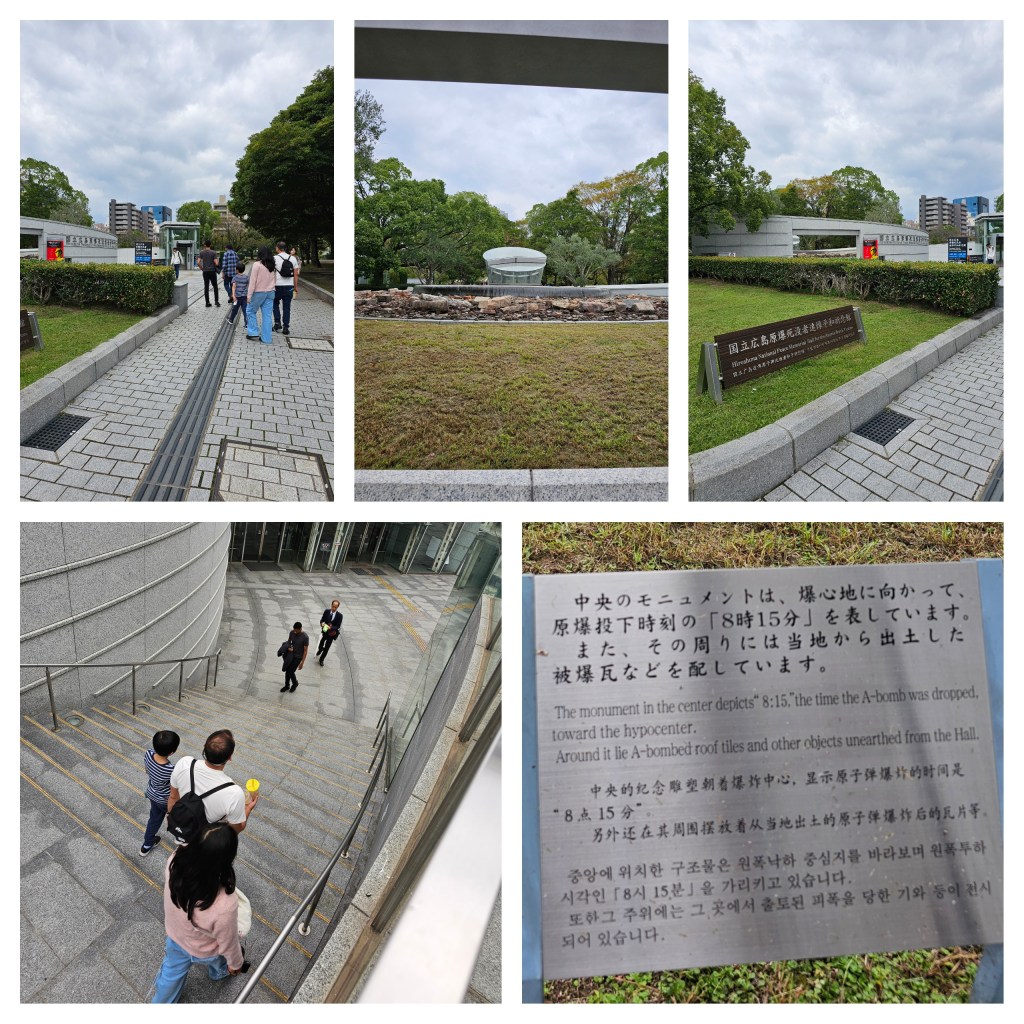 “The monument in the center depicts ‘8:15’, the time the A-bomb was dropped toward the hypocenter. Around it lie A-bombed roof tiles and other objects unearthed from the Hall”