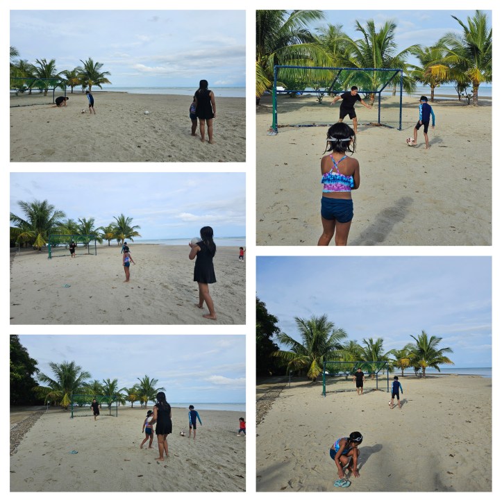 Ate Rei is now playing the volleyball, Hearty is looking for shells, while Sai and Tito Dou is still in there one-on-one soccer match.