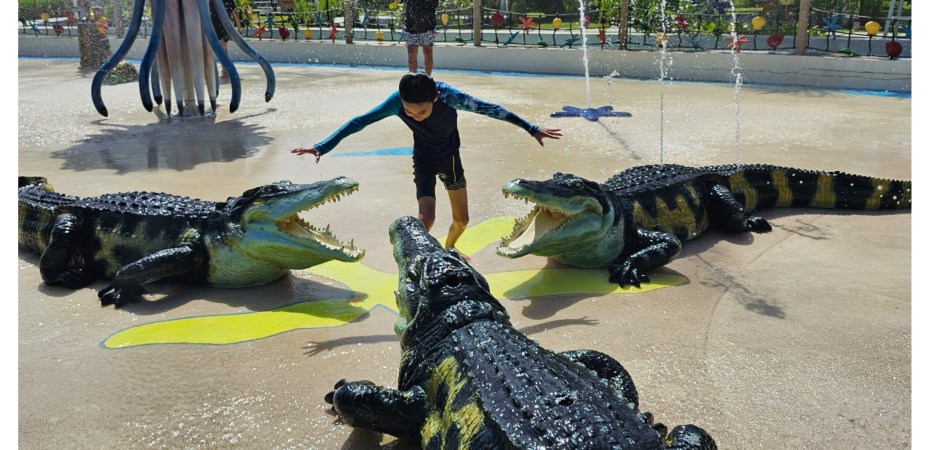 Sai is having fun with the crocs. He imagines them as the dinosaurs in one of the scenes in the Jurassic World movie.