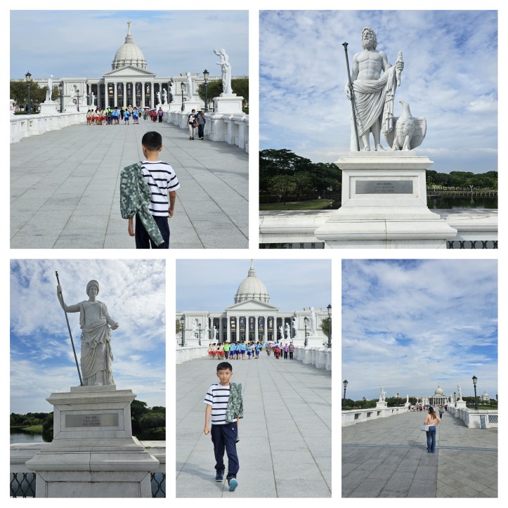Neoclassical style, resembling European palaces like Versailles and the White House. This is the Olympus Bridge: Decorated with white lion heads and statues of Greek gods.